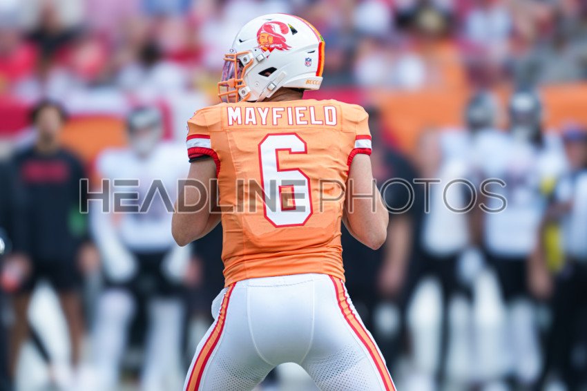 Tampa Bay, Florida, USA, October 27, 2024, Tampa Bay Buccaneers quarterback Baker Mayfield #6 looking to make a pass at Raymond James Stadium. (Photo Credit: Marty Jean-Louis)