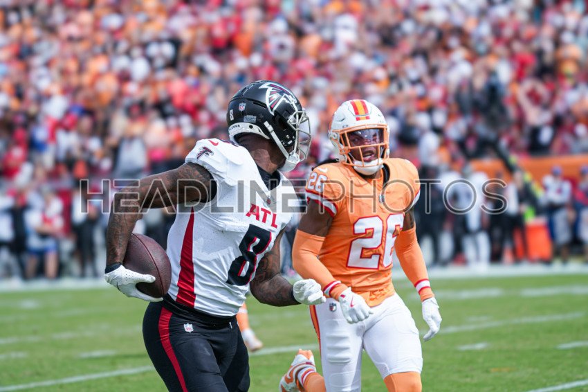 Tampa Bay, Florida, USA, October 27, 2024, Atlanta Falcons Tight End Kyle Pitts #8 makes a catch resulting in a touchdown at Raymond James Stadium. (Photo Credit: Marty Jean-Louis)