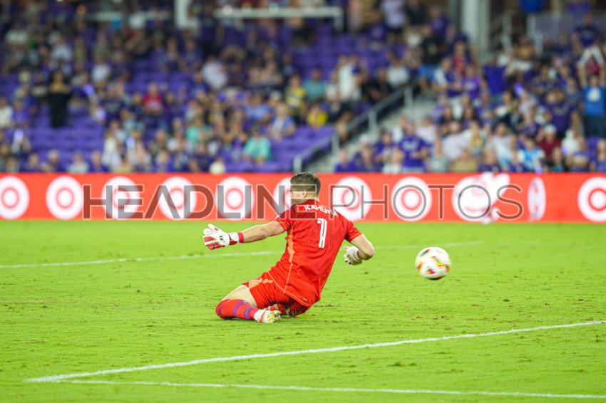 Orlando, Florida, USA, October 27, 2024, Charlotte FC goalkeeper Kristijan Kahlina #1 misses the ball during the first half at Inter&Co Stadium. (Photo Credit: Marty Jean-Louis)