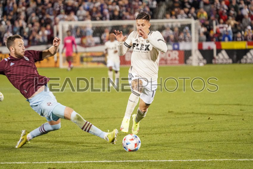Denver, Colorado, USA, November 7, 2021, Los Angeles FC forward Brian Rodriquez attempt to pass defender at Dick’s Sporting Goods Park (Photo Credit: Marty Jean-Louis)