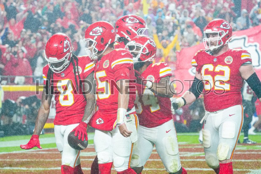 Kansas City, Missouri, USA, November 4, 2024, Kansas City Chiefs quarterback Patrick Mahomes #15 and DeAndre Hopkins #8 celebrate after a touchdown at GEHA Field Arrowhead Stadium. (Photo Credit: Marty Jean-Louis)