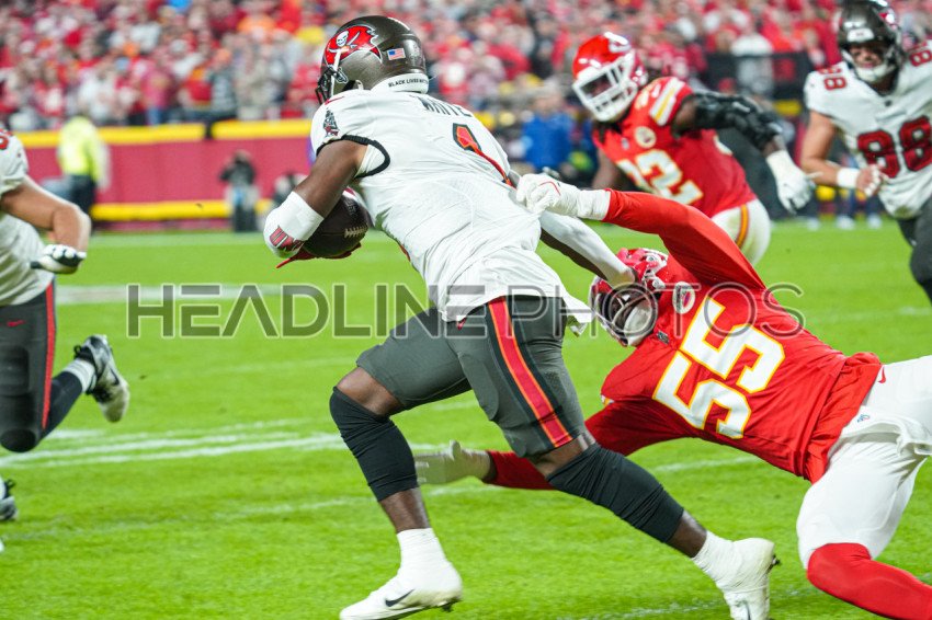 Kansas City, Missouri, USA, November 4, 2024, Tampa Bay Buccaneers player Rachaad White #1 gets tackled by Joshua Uche #55 at GEHA Field Arrowhead Stadium. (Photo Credit: Marty Jean-Louis)
