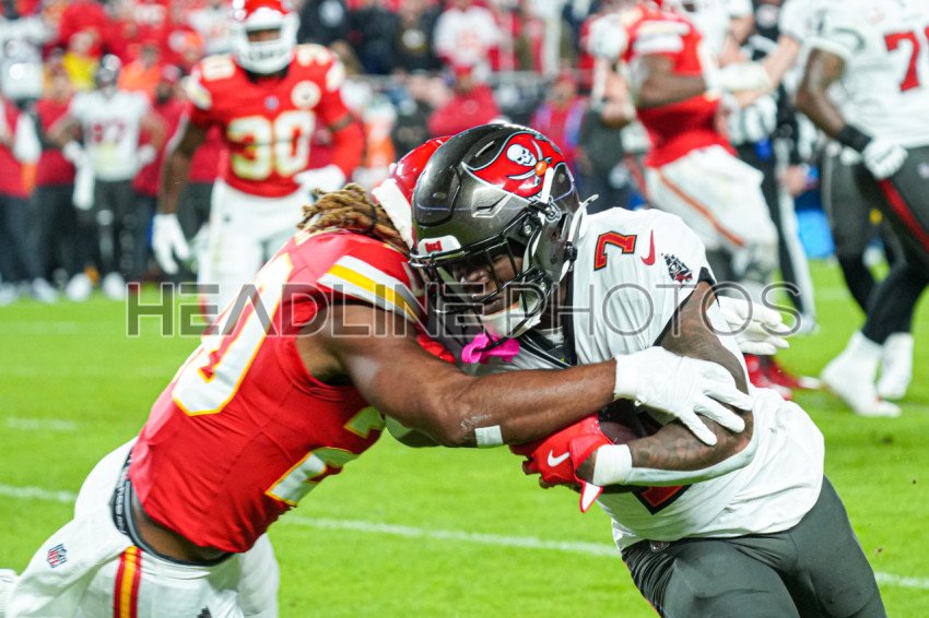Kansas City, Missouri, USA, November 4, 2024, Tampa Bay Buccaneers player Bucky Irving #7 gets tackled at GEHA Field Arrowhead Stadium. (Photo Credit: Marty Jean-Louis)