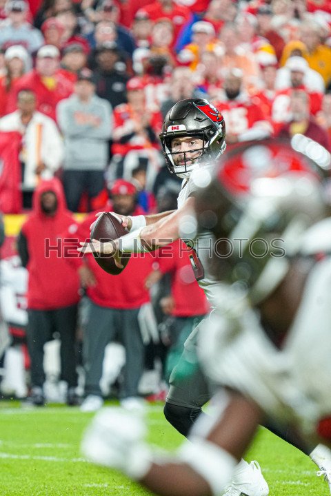 Kansas City, Missouri, USA, November 4, 2024, Tampa Bay Buccaneers quarterback Baker Mayfield #6 readies to make a pass at GEHA Field Arrowhead Stadium. (Photo Credit: Marty Jean-Louis)