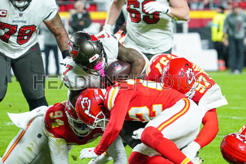 Kansas City, Missouri, USA, November 4, 2024, Tampa Bay Buccaneers player Bucky Irving #7 gets tackled at GEHA Field Arrowhead Stadium. (Photo Credit: Marty Jean-Louis)