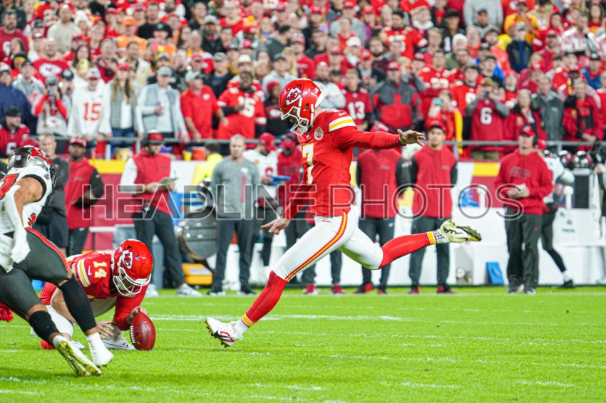 Kansas City, Missouri, USA, November 4, 2024, Kansas City Chiefs kicker Harrison Butker #7 makes a kick at GEHA Field Arrowhead Stadium. (Photo Credit: Marty Jean-Louis)