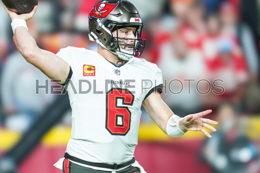 Kansas City, Missouri, USA, November 4, 2024, Tampa Bay Buccaneers quarterback Baker Mayfield #6 makes a pass at GEHA Field Arrowhead Stadium. (Photo Credit: Marty Jean-Louis)