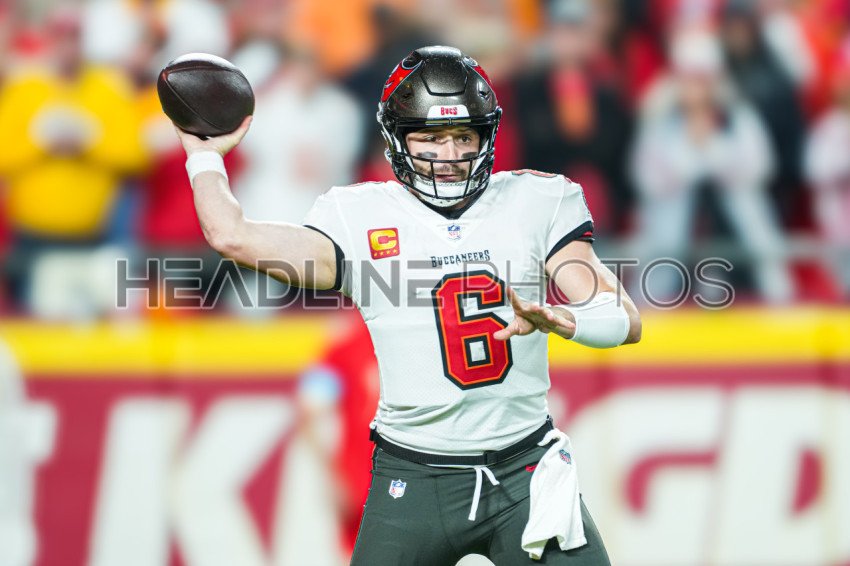Kansas City, Missouri, USA, November 4, 2024, Tampa Bay Buccaneers quarterback Baker Mayfield #6 makes a pass at GEHA Field Arrowhead Stadium. (Photo Credit: Marty Jean-Louis)