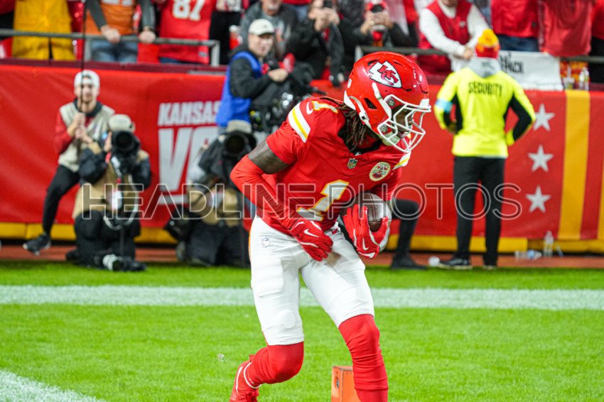 Kansas City, Missouri, USA, November 4, 2024, Kansas City Chiefs wide receiver Xavier Worthy #1 makes a run after receiving the ball at GEHA Field Arrowhead Stadium. (Photo Credit: Marty Jean-Louis)