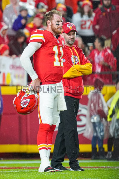 Kansas City, Missouri, USA, November 4, 2024, Kansas City Chiefs quarterback Carson Wentz #11 warming up at GEHA Field Arrowhead Stadium. (Photo Credit: Marty Jean-Louis)