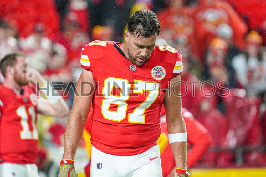 Kansas City, Missouri, USA, November 4, 2024, Kansas City Chiefs Tight End Travis Kelce #87 warming up at GEHA Field Arrowhead Stadium. (Photo Credit: Marty Jean-Louis)