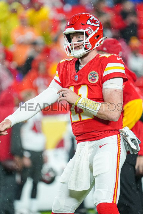Kansas City, Missouri, USA, November 4, 2024, Kansas City Chiefs quarterback Carson Wentz #11 warming up at GEHA Field Arrowhead Stadium. (Photo Credit: Marty Jean-Louis)