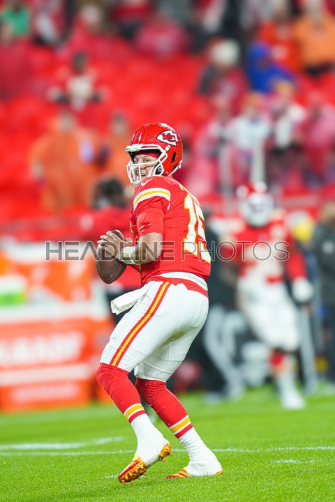 Kansas City, Missouri, USA, November 4, 2024, Kansas City Chiefs quarterback Patrick Mahomes #15 warming up at GEHA Field Arrowhead Stadium. (Photo Credit: Marty Jean-Louis)