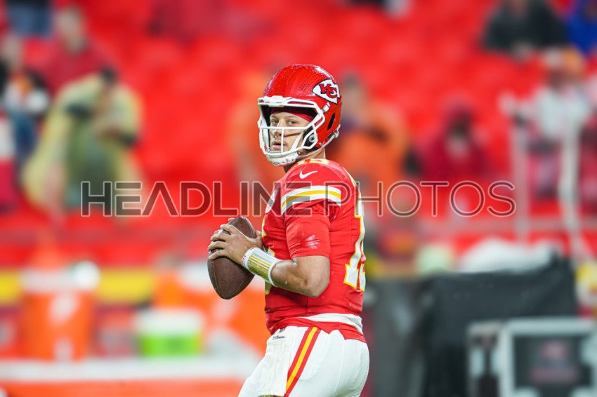 Kansas City, Missouri, USA, November 4, 2024, Kansas City Chiefs quarterback Patrick Mahomes #15 warming up at GEHA Field Arrowhead Stadium. (Photo Credit: Marty Jean-Louis)