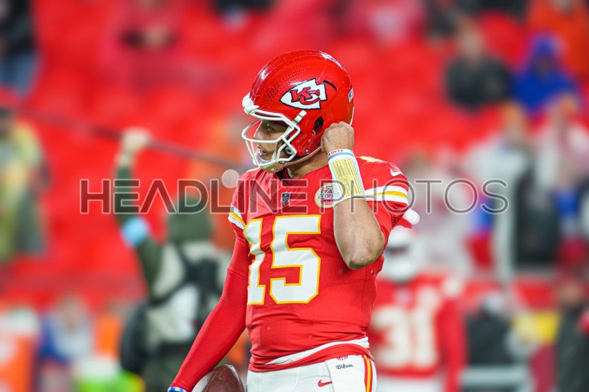 Kansas City, Missouri, USA, November 4, 2024, Kansas City Chiefs quarterback Patrick Mahomes #15 warming up at GEHA Field Arrowhead Stadium. (Photo Credit: Marty Jean-Louis)