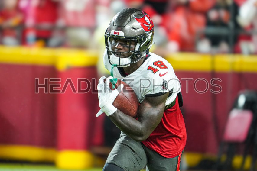 Kansas City, Missouri, USA, November 4, 2024, Tampa Bay Buccaneers wide receiver Rakim Jarrett #18 warming up at GEHA Field Arrowhead Stadium. (Photo Credit: Marty Jean-Louis)
