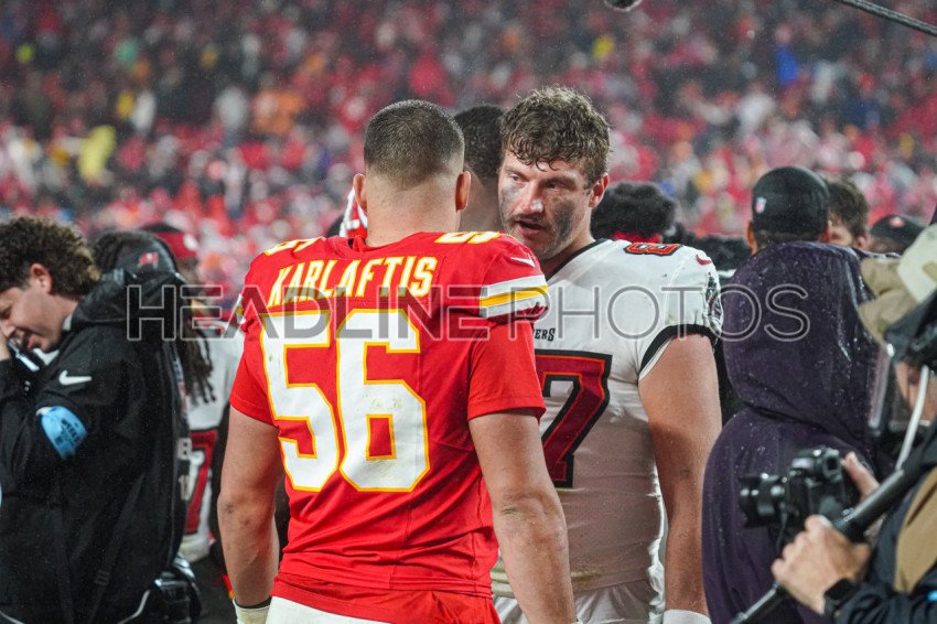 Kansas City, Missouri, USA, November 4, 2024, Tampa Bay Buccaneers player Payne Durham #87 and Kansas City Chiefs player George Karlaftis #56 share some words at GEHA Field Arrowhead Stadium. (Photo Credit: Marty Jean-Louis)