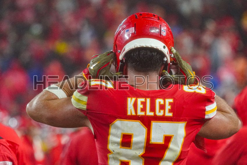 Kansas City, Missouri, USA, November 4, 2024, Kansas City Chiefs tight end Travis Kelce #87 puts on his helment during overtime at GEHA Field Arrowhead Stadium. (Photo Credit: Marty Jean-Louis)