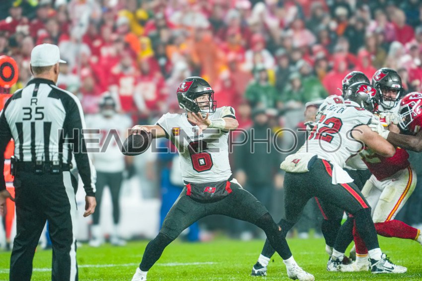 Kansas City, Missouri, USA, November 4, 2024, Tampa Bay Buccaneers quarterback Baker Mayfield #6 makes a pass at GEHA Field Arrowhead Stadium. (Photo Credit: Marty Jean-Louis)