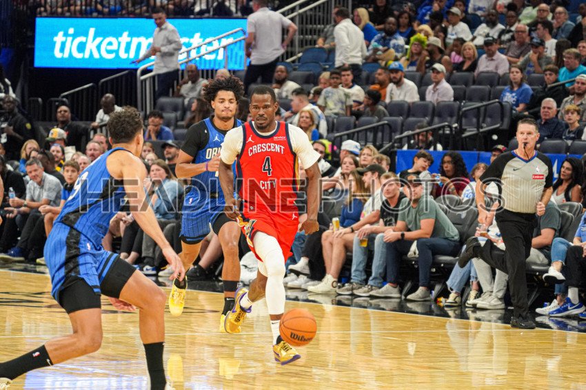 Orlando, Florida, USA, November 8, 2024, New Orleans Pelicans guard Javonte Green #4 rushes forward at the Kia Center. (Photo Credit: Marty Jean-Louis)