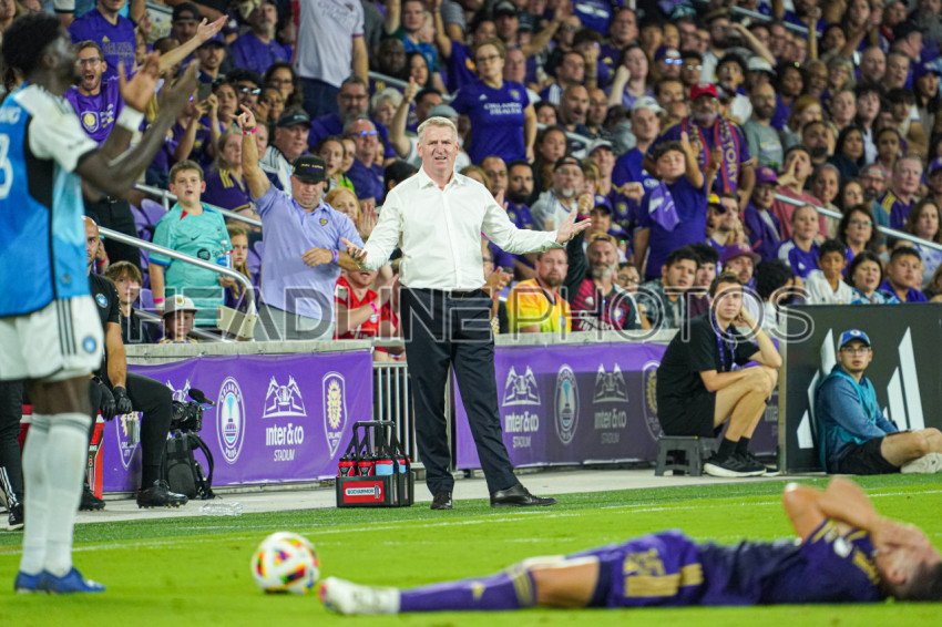 Orlando, Florida, USA, November 9, 2024, Charlotte FC head coach Dean Smith contesting a foul call at Inter&Co Stadium. (Photo Credit: Marty Jean-Louis)