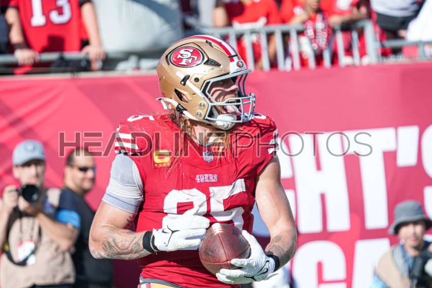 Tampa Bay, Florida, USA, November 10, 2024, San Francisco 49ers tight end George Kittle #85 celebrate after making a touchdown in the second half at Raymond James Stadium. (Photo Credit: Marty Jean-Louis)