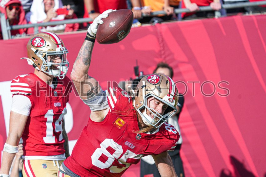 Tampa Bay, Florida, USA, November 10, 2024, San Francisco 49ers tight end George Kittle #85 spikes the ball after making a touchdown in the second half at Raymond James Stadium. (Photo Credit: Marty Jean-Louis)