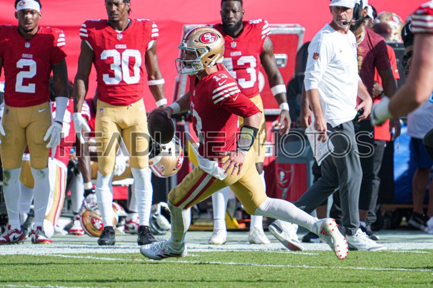 Tampa Bay, Florida, USA, November 10, 2024, San Francisco 49ers quarterback Brock Purdy #13 on the run at Raymond James Stadium. (Photo Credit: Marty Jean-Louis)