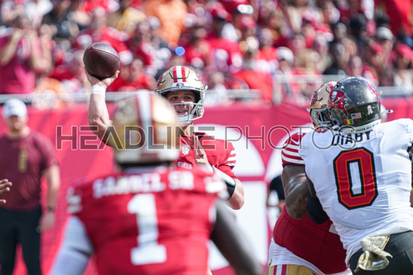 Tampa Bay, Florida, USA, November 10, 2024, San Francisco 49ers quarterback Brock Purdy #13 makes a pass at Raymond James Stadium. (Photo Credit: Marty Jean-Louis)