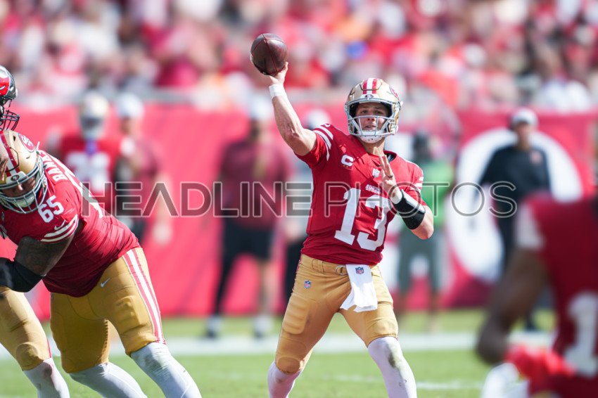 Tampa Bay, Florida, USA, November 10, 2024, San Francisco 49ers quarterback Brock Purdy #13 makes a pass at Raymond James Stadium. (Photo Credit: Marty Jean-Louis)