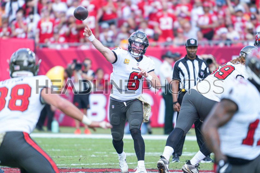 Tampa Bay, Florida, USA, November 10, 2024, Tampa Bay Buccaneers quarterback Baker Mayfield #6 makes a pass at Raymond James Stadium. (Photo Credit: Marty Jean-Louis)