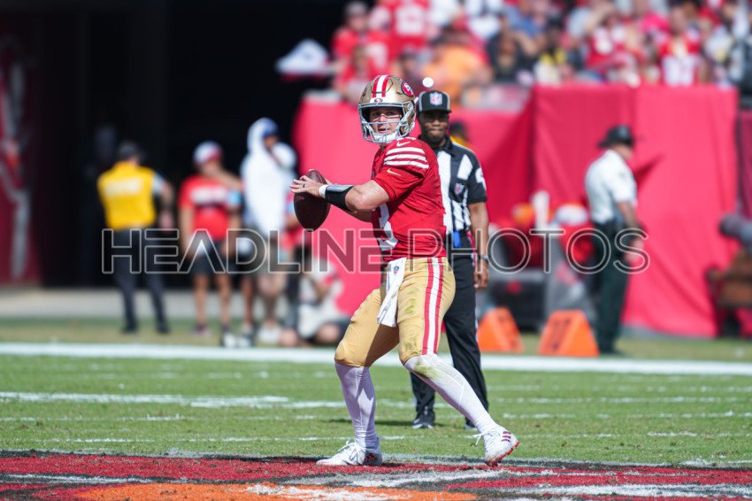 Tampa Bay, Florida, USA, November 10, 2024, San Francisco 49ers quarterback Brock Purdy #13 makes a pass at Raymond James Stadium. (Photo Credit: Marty Jean-Louis)