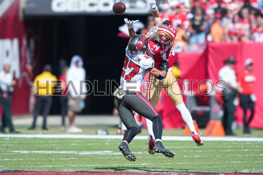 Tampa Bay, Florida, USA, November 10, 2024, San Francisco 49ers wide receiver Ricky Pearsall #14 misses the pass as Zyon McCollum #27 adds pressure at Raymond James Stadium. (Photo Credit: Marty Jean-Louis)