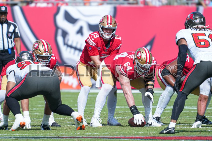 Tampa Bay, Florida, USA, November 10, 2024, San Francisco 49ers quarterback Brock Purdy #13 readies to receive the ball at Raymond James Stadium. (Photo Credit: Marty Jean-Louis)