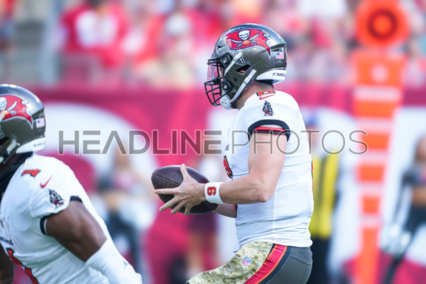 Tampa Bay, Florida, USA, November 10, 2024, Tampa Bay Buccaneers quarterback Baker Mayfield #6 readies to make a pass at Raymond James Stadium. (Photo Credit: Marty Jean-Louis)