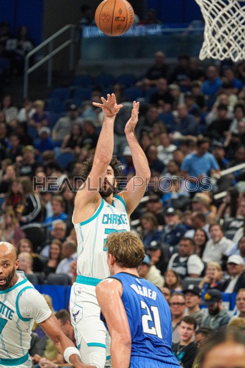 Orlando, Florida, USA, November 12, 2024, Charlotte Hornets guard Vasa Micic #22 shoots a three at the Kia Center. (Photo Credit: Marty Jean-Louis)