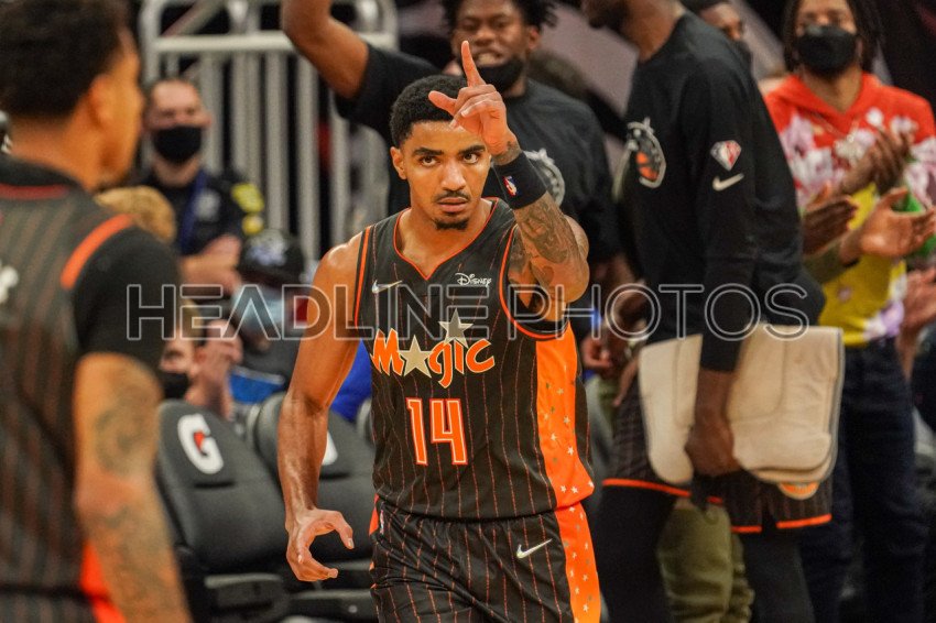 Orlando, Florida, USA, January 26, 2022, Orlando Magic Shooting Guard Gary Harris #14 reacts after making a three point shot at the Amway Center. (Photo Credit: Marty Jean-Louis)