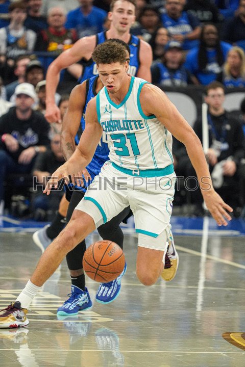 Orlando, Florida, USA, November 12, 2024, Charlotte Hornets forward Tidjane Salaun #31 rushes forward at the Kia Center. (Photo Credit: Marty Jean-Louis)
