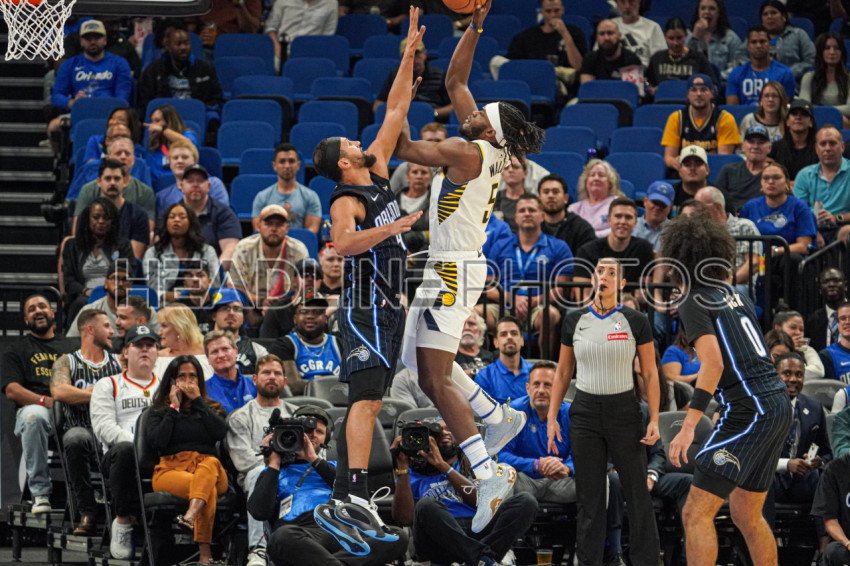 Orlando, Florida, USA, November 12, 2024, Indiana Pacers forward Jarace Walker #5 attempt to score while Jalen Suggs #4 attempt to block at the Kia Center. (Photo Credit: Marty Jean-Louis)