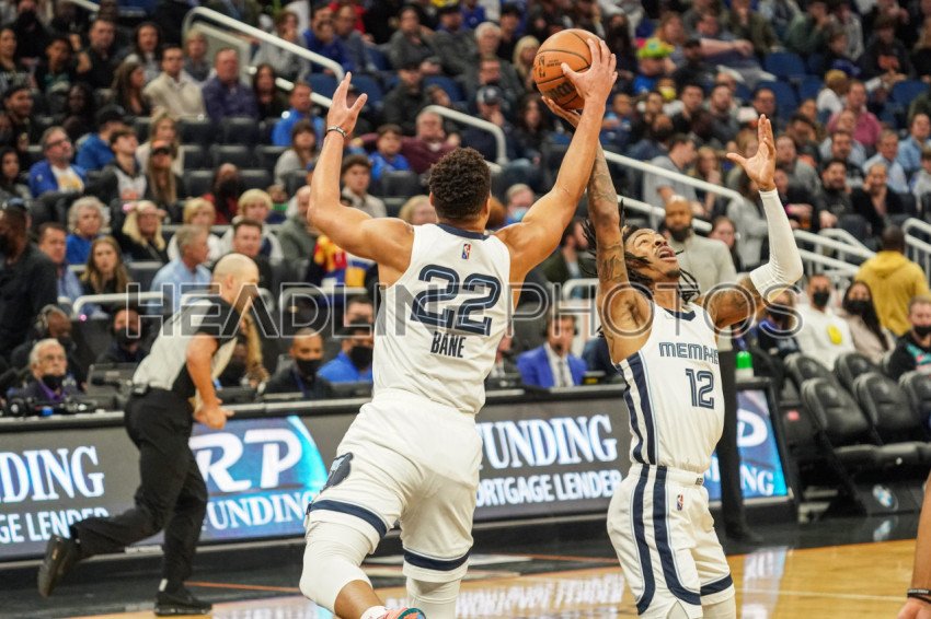 Orlando, Florida, USA, February 5, 2022,Memphis Grizzlies players Desmond Bane #22 and Ja Morant #12 gets a rebound at the Amway Center. (Photo Credit: Marty Jean-Louis)