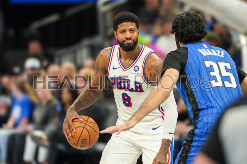 Orlando, Florida, USA, November 15, 2024, Philadelphia 76ers forward Paul George #8 face Goga Bitadze #35 at the Kia Center. (Photo Credit: Marty Jean-Louis)