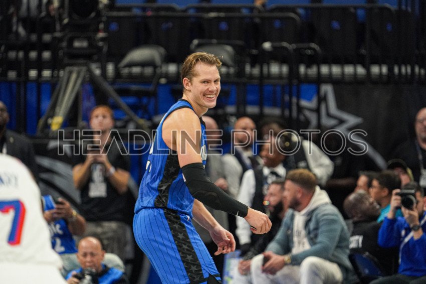 Orlando, Florida, USA, November 15, 2024, Orlando Magic center Moritz Wagner #21 smiles after making a three at the Kia Center. (Photo Credit: Marty Jean-Louis)
