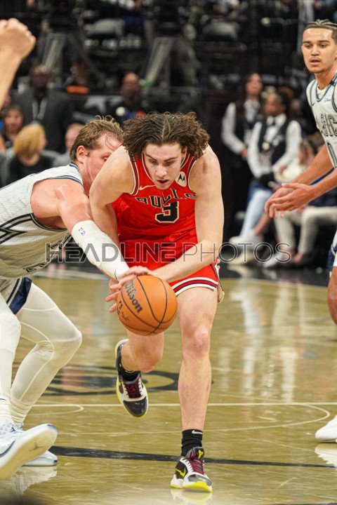 Orlando, Florida, USA, November 27, 2024, Chicago Bulls player Josh Giddey #3 is fouled by Moritz Wagner #21 at the Kia Center. (Photo Credit: Marty Jean-Louis)