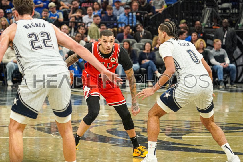 Orlando, Florida, USA, November 27, 2024, Chicago Bulls guard Lonzo Ball #2 attempt to run pass Magic players at the Kia Center. (Photo Credit: Marty Jean-Louis)