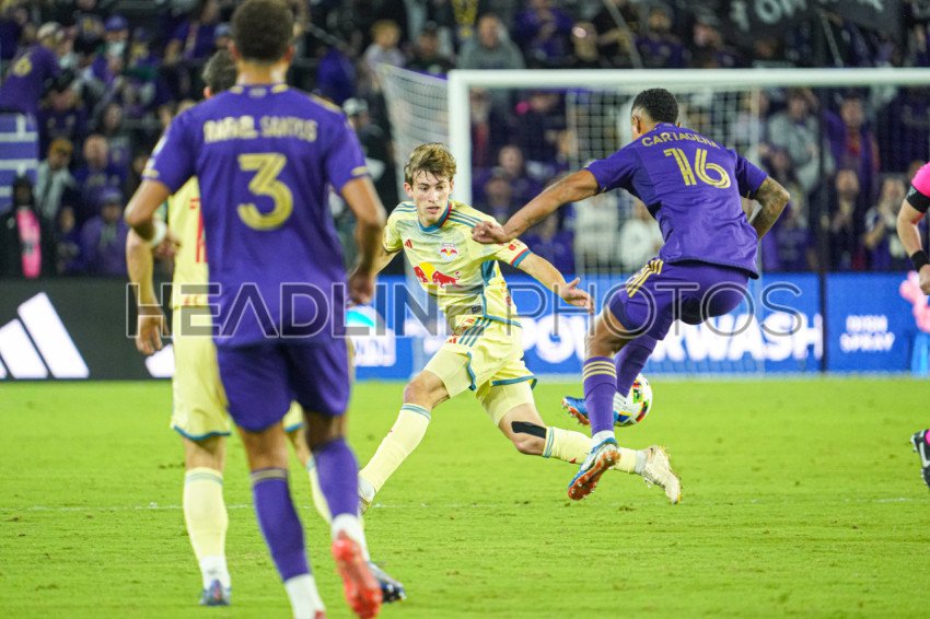 Orlando, Florida, USA, November 30, 2024, New York Red Bulls defender Sean Nealis #15 makes a pass but is caught by Wilder Cartagena #16 at Inter&Co Stadium. (Photo Credit: Marty Jean-Louis)