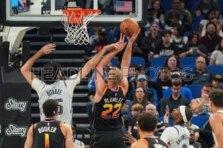 Orlando, Florida, USA, December 8, 2024, Phoenix Suns center Mason Plumlee #22 attempt to score but is fouled by Goga Bitadze #35 at the Kia Center. (Photo Credit: Marty Jean-Louis)