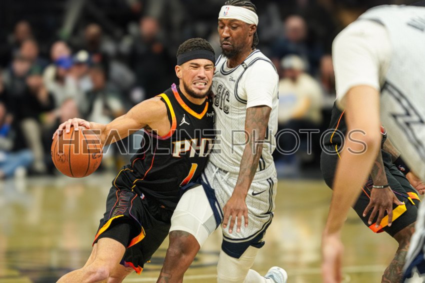 Orlando, Florida, USA, December 8, 2024, Phoenix Suns fguard Devin Booker #21 pushes forward but gets fouled by Kentavious Caldwell-Pope (KCP) #3 at the Kia Center. (Photo Credit: Marty Jean-Louis)