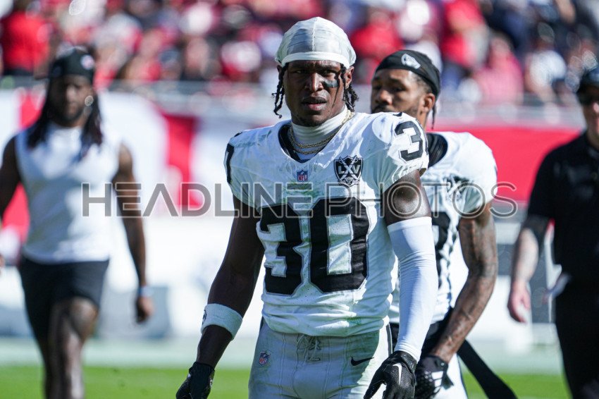Tampa Bay, Florida, USA, December 8, 2024, Las Vegas Raiders player Darnay Holmes #30 at Raymond James Stadium. (Photo Credit: Marty Jean-Louis)