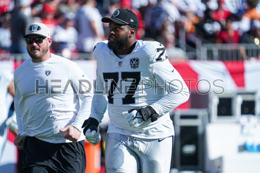 Tampa Bay, Florida, USA, December 8, 2024, Las Vegas Raiders player Thayer Munford Jr #77 at Raymond James Stadium. (Photo Credit: Marty Jean-Louis)