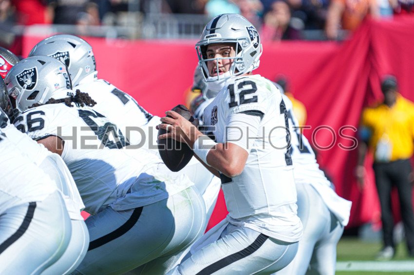 Tampa Bay, Florida, USA, December 8, 2024, Las Vegas Raiders quarterback Aidan O'Connel #12 readies to make a pass at Raymond James Stadium. (Photo Credit: Marty Jean-Louis)